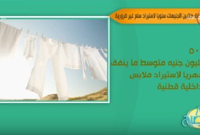 أضاف أنه يتم استيراد الملابس الداخلية القطنية بحوالي 500 مليون جنيه شهريًا، كما أن استيراد المثلجات شهريًا يصل إلى 3,5 مليون جنيه، و175 مليون جنيه ينفق شهريًا كمتوسط لاستيراد المكسرات، في حين يتم صرف 33 مليون جنيه شهريا لاستيراد العطور والشامبوهات، واستيراد شهريا بـ 50 مليون جنيه كمتوسط ينفق لشراء المشروبات الكحولية، و50 مليون جنيه كمتوسط ينفق شهريا لاستيراد التبغ.