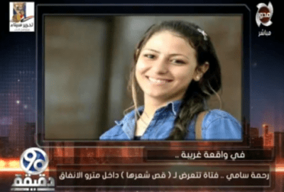 قالت “رحمة” في مداخلة هاتفية مع الإعلامي معتز الدمرداش مقدم برنامج “90 دقيقة” المذاع على شاشة “المحور”، اليوم الإثنين، إن المرأة التي قامت بتلك الواقعة هي إمرأة محجبة في الثلاثينيات من عمرها، ترتدي “بنطالا وبلوزة”، ومستواها الاجتماعي متوسط وتبدو عاقلة، لكنها رغم هذا أخرجت “آلة حادة” من حقيبتها وحاولت قص شعرها.