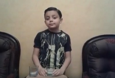 قال الطفل خلال الفيديو: “أنا بقول للأسرى الفلسطينيين ربنا معاكم وربنا يفك أسركم”، ثم سكب الماء على الملح وشربه.
