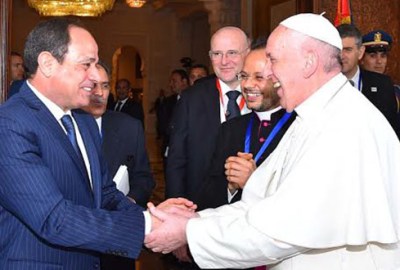 أشكركم، فخامة الرئيس، من أجل كلمات الترحاب الطيبة ومن أجل الدعوة التي تفضلتم بتوجيهها لي لزيارة بلدكم الحبيب. لا زلت أتذكر زيارتكم لروما، في شهر نوفمبر 2014، وكذلك اللقاء الأخوي مع قداسة البابا تواضروس الثاني، سنة 2013، ومع الإمام الأكبر لجامعة الأزهر، الدكتور أحمد الطيب، العام المنصرم.