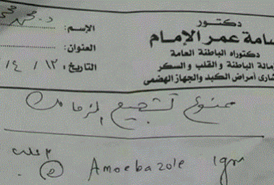 تداول رواد مواقع التواصل الاجتماعي، على مدار الساعات الماضية، صورة لـ”روشتة” علاجية، للطبيب أسامة عمر الإمام، من مدينة المنصورة، دوّن فيها عبارة “ممنوع تشجيع الزمالك”، حيث وجه المريض بعدم تشجيع ذلك الفريق، نظرًا للخسارة التي تلحق به في الفترة الأخيرة.
