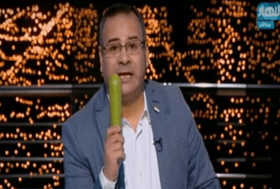 وظهر مقدم برنامج “آخر النهار” وبيده حبات من “الكوسة”، متابعًا :”احنا راضعين كوسة وبناكلها”، وأكلها على الهواء، ثم قام بوضع سائل من مُطهر طبي أحمر اللون على رأسه، ليوضح أن “كلنا على راسنا بطحة، ومحدش يزايد على حد”، متابعًا :”زمان الكوسة كانت صغيرة، دلوقت كل ما تروح بتكبر”.