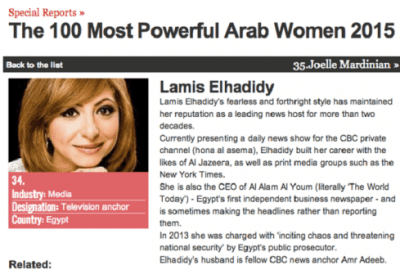 أصدرت مجلة ” أرابيان بيزنس ” قائمة 100 امرأة للنساء الأكثر تأثيراً في الوطن العربي ، وقد تضمنت القائمة الإعلامية لميس الحديدي والتي جاءت في المركز 34.