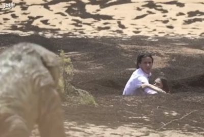انتهى الحوار سريعًا، واستقل رمضان صبحي، السيارة مع واحدة من فريق البرنامج، لتصوير برومو الحلقة وسط الصحراء، حيث كان رامز جلال في انتظاره، مُرتديًا مانيكان سحلية “تنين كومودو”.