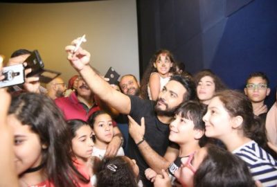 أوقفت إدارة السينما عرض الفيلم لمدة زادت عن نصف ساعة، كي تتيح للشباب التقاط الصور مع “حسني”، الذي سألهم عن رأيهم في الفيلم والمشاهد التي جمعته من نجوم العمل.