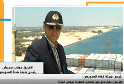 أشار رئيس هيئة قناة السويس، أن الهيئة الاقتصادية للقناة ملتزمة بجميع الاتفاقيات التي وقعت عليها الدولة المصرية، التي تفيد بأن قناة السويس مجرى ملاحي عالمي لا يجوز إغلاقه أمام حركة السفن العابرة، موضحا أن السفن القطرية التي تمر بموانئ المنطقة ليست حاملة للبضائع كبيرة الحجم إنما هى عبارة عن سفن ناقلة للغاز، والتي لا يمكن منع عبورها.