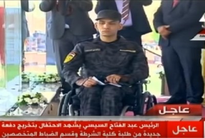 وأضاف “رامي” الذي ظهر جالسًا على كرسي متحرك، في حفل تخريج دفعة جديدة من كلية الشرطة: “بسم الله أنا النقيب رامي جمال، ضابط مصري، بقطاع الأمن المركزي، أصبت يوم 14 أغسطس 2013، وقفنا بكل إيمان نقابل أي رصاصة غدر نفدي بيها المصريين، لتخليصنا من قوى الشر، أثناء تأمين ممرات الخروج الآمن”.