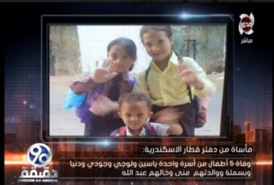 لقي 5 أطفال من أسرة واحدة ووالدتهم وخالهم، مصرعهم في حادث تصادم قطارين بالقرب من محطة خورشيد بالإسكندرية، والذي وقع بعد ظهر أمس الجمعة، ووصل عدد المتوفين جراء الحادث إلى 41 فضلًا عن إصابة أكثر من 130 آخرين.