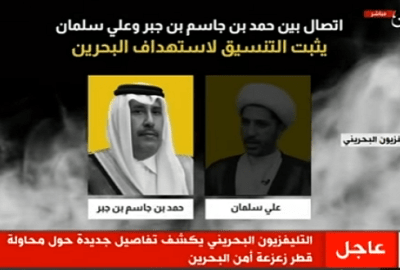بث تلفزيون البحرين، اليوم الأربعاء، اتصالاً هاتفيًا لرئيس وزراء قطر السابق حمد بن جاسم مع الأمين العام لجمعية الوفاق المنحلة علي سلمان المدان بالإرهاب يكشف تآمر النظام القطري على قلب نظام الحكم في البحرين.