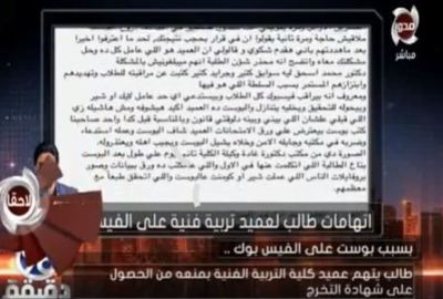 أضاف أن ما حدث هو أن هناك طالبة ضُبطت متلبسة بقضية غش أثناء امتحان العملي، وكان القرار أن يتم فصلها، مشيرًا إلى أنها كتبت منشور على “فيس بوك” تقول فيه أنها تعرضت لظلم من الكلية.