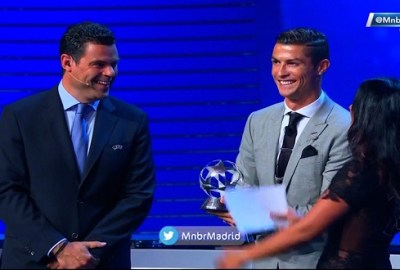 تسلم رونالدو الجائزة خلال الحفل المقام حالياً في موناكو، لإجراء قرعة دور المجموعات للموسم الجديد من البطولة، وتسليم جوائز أفضل اللاعبين في القارة العجوز.