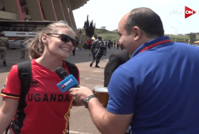 وأجرى مهيب عدد من اللقاءات مع مشجعي أوغندا المتواجدين في محيط ملعب المباراة، والتي كان منها مواطنة إنجليزية ترتدي قميص منتخب أوغندا، حيث قالت إنها من إنجلترا ولكنها تقيم في أوغندا، لافتة إلى أنها تتوقع فوز مصر بالمباراة، مشيرة إلى أنها تعرف اللاعب محمد صلاح كونه لاعبا في صفوف ليفربول الإنجليزي، لكنها تكرهه بشدة لأنه أحرز هدفا في شباك فريقها المفضل في إنجلترا.