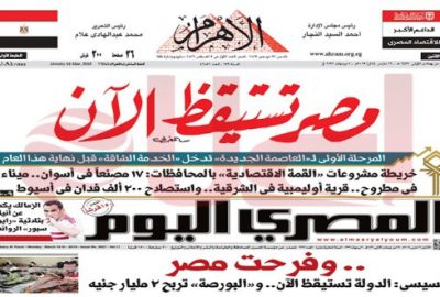 اختارت ثلاثة من الصحف المصرية عنوان “مصر تستيقظ الان” من كلمة الرئيس عبد الفتاح السيسي في ختام المؤتمر الاقتصادي أمس لتكون على صدر صفحتها الأولى.