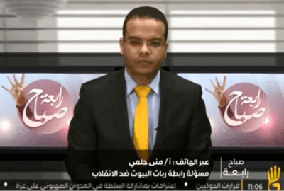 يحاول الإعلام الإخواني، من وقت لآخر، اختراع أساليب جديدة، ليظهر اتساع رقعة المعارضة لما يسميه “الانقلاب”، ففي مداخلة هاتفية على قناة “رابعة” الإخوانية، استقبل المذيع اتصالًا هاتفيًا من سيدة تدعى “منى حلمي”، والتي عرفت نفسها بـ”مسئولة رابطة ربات البيوت ضد الانقلاب”.