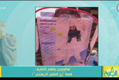 عرض الإعلامي رامي رضوان الصورة التي تم تداولها أمس على مواقع التواصل الاجتماعي لزي تنكري يباع في أحد المولات الشهيرة لطفل إرهابي، وذلك لاستخدامه في عيد “الهالوين” القادم.