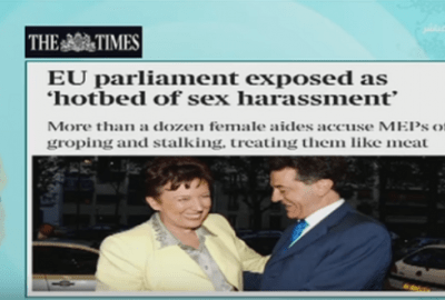 أضاف “رضوان” أن الأمور بدأت تتجه للبرلمان الأوروبي لعكس ما يحدث به من تجاوز، حيث نشرت صحيفة الـ “تايمز” الإنجليزية أخبارًا تفيد تحول البرلمان الأوروبي لملتقى للتحرش الجنسي، حيث تعرضت أكثر من 12 سيدة من المساعدين داخل البرلمان للتحرش شبهن التعامل معهن داخل البرلمان على أنهن “لحوم”.
