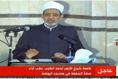 أكد الدكتور أحمد الطيب خلال كلمته اليوم بمسجد الروضة، في شمال سيناء، أثناء شعائر صلاة الجمعة، التي بثها التيلفزيون من منطقة بئر العبد، أن منفذي العملية الإرهابية على المسجد هم خوارج وقتلة، والنبي أمر بقتلهم وتعقبهم ووعد من يقتلهم بالثواب يوم القيام.