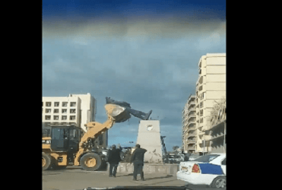 أظهر الفيديو عملية النقل التي تمت بطريقة بدائية، حيث تم رفعه من قاعدته بالميدان المخصص له أمام حديقة المسلة، ما تسبب في حدوث كسور في جزء منه، لذا وجهت الاتهامات لمسؤولي الحي والمحافظ بالإهمال في التعامل مع التمثال واسقاطه من أعلى قاعدته على إحدى السيارات.