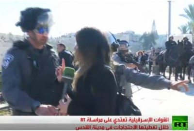 تعرضت داليا النمري مراسلة شبكة “روسيا اليوم”، لاعتداء من قِبل أحد جنود الاحتلال الإسرائيلي، وذلك أثناء نقلها للأحداث والاشتباكات التي جرت في القدس المحتلة أمس الجمعة، احتجاجًا على قرار الرئيس الأمريكي دونالد ترامب بنقل السفارة الأمريكية.