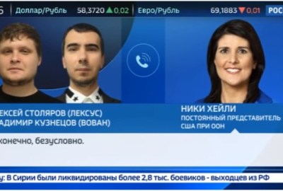 بثت قناة “روسيا 24” تسجيلاً صوتيًا لاتصال الروسيين “فوفان” و”لكسوس” المشهورين بـ”prank call” أو الاتصالات المزعجة، لمندوبة واشنطن لدى الأمم المتحدة “نيكي هايلي”، حيث تمكن الروسيان من الوصول إليها والإيقاع بها.