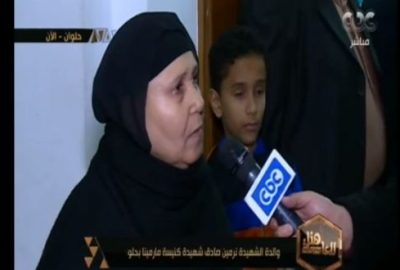 قالت والدة الشهيدة نرمين صادق، ضحية محاولة استهداف كنيسة مارمينا بحلوان، الشهر الماضي إنها تشعر بالاطمئنان والراحة، فهي تعلم أن ابنتها في السماء تتشفع لأهلها فهي شهيدة، مضيفة أنها سعيدة في السماء.