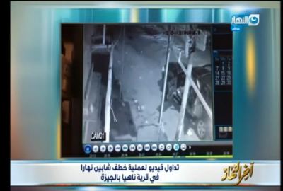 عرض برنامج “آخر النهار” مقطعًا مصوَّرًا لعملية خطف شابين نهارًا بقرية “ناهيا” في محافظة الجيزة؛ حيث يظهر فى الفيديو مجموعة من المسلحين ملثمين الوجه ويحملون أسلحة نهارًا، ويتحركون بها وسط الشارع على مرأى ومسمع من المارة في الطريق.