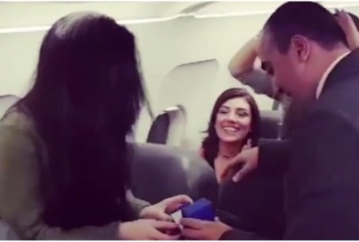 فاجأ عيد ريشا في الطائرة وطلب يدها أمام الجميع عبر مكبر الصوت قائلًا: “سيداتي سادتي، أسعدتم مساء، لست كابتن الطائرة أو طاقم العمل، ولن أطلعكم على أحوال الطقس في قبرص رغم أننا سنصل إلى هناك قريباً، ولكنني أودّ أن أسال أحد الركاب، رنا هل تتزوجينني؟”، رنا لحظة سماع اسمها تفاجأت، ليخرج جورج ويقدّم لها خاتم الزواج ويسألها مجدداً: “هل تتزوجينني”، فأجابت: “نعم، بكل تأكيد”، بحسب “النهار” اللبنانية.