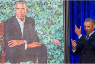 ألقى الرئيس الأمريكي السابق باراك أوباما تعليقات مازحة عن أذنيه وشعره الرمادي، عند إزاحة الستار عن اللوحة الزيتية التي رُسمت له في معرض الصور الوطني الذي تديره مؤسسة سميثسونيان.