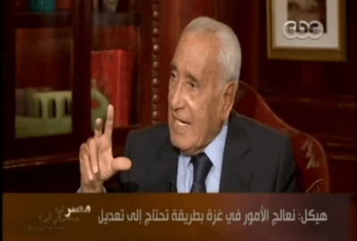 حذر هيكل من خطور الوضع الإنساني في قطاع غزة، واصفًا القطاع بـ”القنبلة”، والتي وإن انفجرت فستصيب مصر، وعندها يمكن أن يقتحم الآلاف الحدود، ردًا على حالة الحصار، كما أكد على أن هذه المرحلة الجديدة تقتضي من مصر تصورات وليس مجرد قرارات.