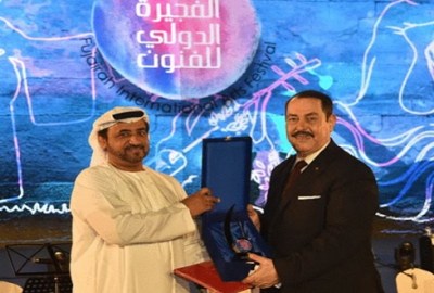كرَّم الشيخ راشد بن حمد الشرقي رئيس هيئة الفجيرة للثقافة والإعلام، الفنان التونسي الكبير لطفي بوشناق، عقب حفله الذي قدمه ضمن فعاليات رابع أيام مهرجان الفجيرة الدولي للفنون في دورته الثانية.