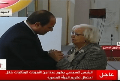 2. قامت الأم ماجدة جبران جورجي الشهيرة بماما ماجي سفيرة السلام، بإهداء الرئيس سوار أخضر اللون، وقامت بإلباسه إياه خلال تكريمها ومنحها وسام الكمال.