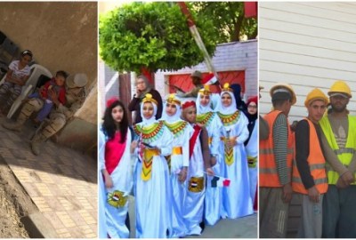 ظهرت بعض الفتيات أما إحدى اللجان في المنصورة وةهن يرتدين ثياب فرعونية، ويحملن علم مصر.