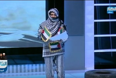 ارتدى الإعلامي جابر القرموطي ملابس مصنوعة من “الشال” الفلسطيني الشهير الذي يعدد رمزُا للمقاومة، خلال حلقة اليوم السبت، من برنامجه “مانشيت القرموطي” على قناة “النهار”.