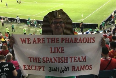 ظهر المشجع معلنًا دعمه للمنتخب الإسباني باستثناء القائد سيرجيو راموس. وكتب المشجع الذي ارتدى الزي الفرعوني على اللافتة: “نحن الفراعنة نشجع إسبانيا ما عدا الابن العاق راموس”.