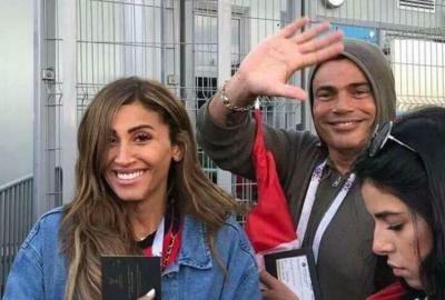 عمرو دياب اثناء دخول الاستاد ودينا الشربينى تحاول تغطيه وشه بطريقه غريبه ، فقالها طيب اهو وبين نفسه اكتر وعمل باى .