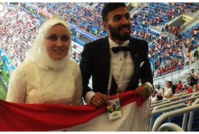 وسط ملعب فولجوجراد الروسي، الذي يشهد حاليا المباراة التي تجمع بين منتخبي مصر والسعودية، ضمن منافسات المجموعة الأولى في كأس العالم روسيا 2018، حضورعروسين مصريين، أرادوا الاحتفال بزفافهم بطريقة مختلفة، وسط مدرجات الجماهير المصرية، وحرص العروسين على التواجد بملابس الزفاف فيالاستاد الذي تُقام فيه المباراة.