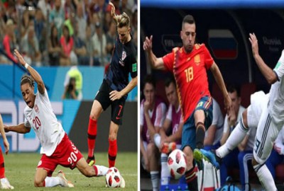 المباراة الأولى جمعت بين المنتخب الروسي ونظيره الإسباني، في تمام الساعة 4 مساءً بتوقيت القاهرة، والتي انتهت لصالح روسيا بنتيجة 4-3 عن طريق ركلات الترجيح، وتأهلها لدور الربع النهائي من البطولة.