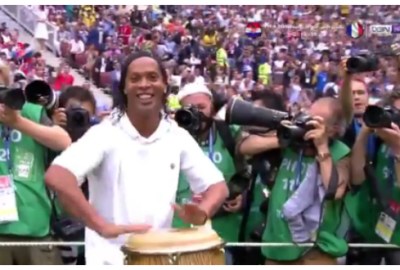 شارك “رونالدينيو” في قرع طبول الحفل الختامي من مونديال روسيا، وسط احتفالات الجمهور من الحضور.