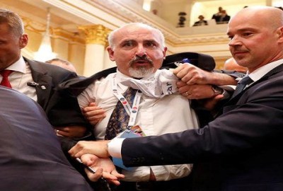 ووفقًا للقطات الفيديو التي أذاعتها عدد من القنوات الإخبارية، فقد ظهر عددا ن رجال الأمن وهم يقومون بإخراج الصحفي عنوة من القاعة التي عُقد فيها المؤتمر الصحفي.