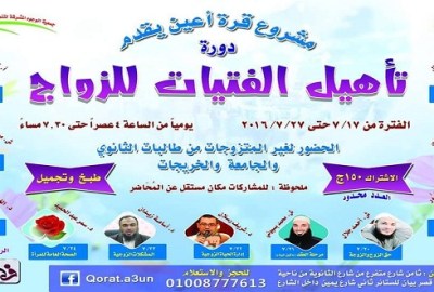 وبالرجوع إلى الصفحة الخاصة بالمؤسسة المنظمة للدورة وجدنا أنها لم تعد موجودة، وبالبحث على موقع “الفيس بوك” عثرنا على إعلانات سابقة لنفس الدورة وأنها ليست الأولى لهذه المؤسسة إنما تم نشر إعلان آخر لنفس المؤسسة يرجع تاريخه إلى يوليو 2016 وإعلان آخر عن دورة أخرى لتأهيل الشباب للزواج بتاريخ أغسطس 2016 جاء تنظيمها بناء على طلبات الجماهير “طبقا لكلام المعلن”!! ولا نعلم هل تمت الدورة أم تم إلغائها.
