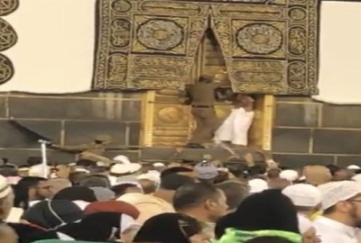 كان قد تداول رواد مواقع التواصل الاجتماعى صورة للحادث، أظهرت رجل يرتدى زى الحج، ويقف على باب الكعبة المشرفة، بينما يقوم رجل أمن بإمساكه.