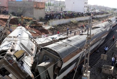 قتل مالايقل عن سبعة أشخاص من بينهم سائق القطار ومساعده، وأصابة أكثر من 80 آخرين منهم 7 في حالة خطر في حادث خروج قطار يربط بين مدينتي الدار البيضاء والقنيطرة في منطقة بوقنادل، عن القضبان قرب العاصمة المغربية الرباط صباح أمس الثلاثاء.