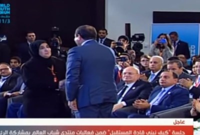 صافح الرئيس عبد الفتاح السيسي، والدة الراحل عبد الوهاب يسري، عضو اللجنة المنظمة للنسخة الأولى من منتدى شباب العالم، الذي توفي أثناء إعداده للمنتدى إثر حادث، مُقدمًا لها تعازيه.