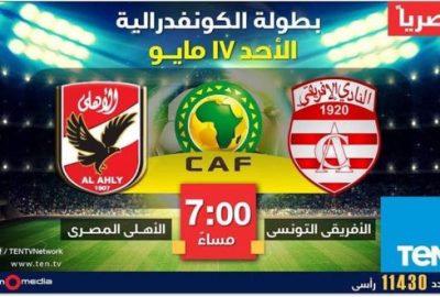 تذيع قناة “TeN” حصريا لقاء الأهلي والإفريقي التونسي في مباراة الذهاب من دور الـ 16 التكميلي من كأس الكونفدرالية. وذلك بعد ان استطاعت الشركة المنتجة “بروموميديا” الحصول على حق العرض الحصري في مزايدة علنية بمقابل 2 مليون و800 الف جنيه.