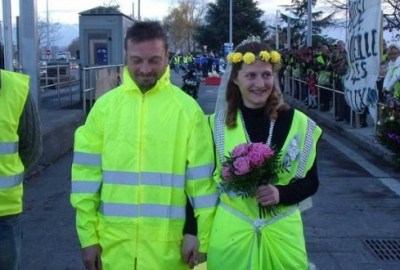 احتفلا رجل وحبيبته بزواجهما خلال فترة الاحتجاج في فرنسا، وهما ينتميان إلى حركة “السترات الصفراء”، في بلدة “tarbes” الفرنسية أمام مئات المحتجين المهنئين لهما بهذه الزيجة.
