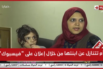 عرض برنامج “صبايا” المُذاع عبر شاشة “الحياة”، مع الإعلامية ريهام سعيد، تقريرًا يستعرض تنازل أم عن ابنتها عن طريق إعلان عبر موقع التواصل الاجتماعي “فيسبوك”.