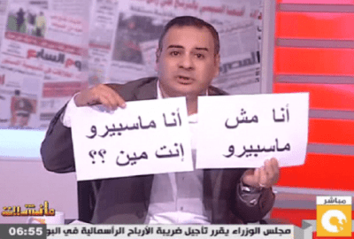 ورفع القرموطي لافتة “إحنا مصريين”، قائلًا: “لا عايزين انت من ماسبيرو.. أو مش من ماسبيرو”، مؤكدًا ان نجاح أي مذيع في التليفزيون المصري أو الخاص، هو نجاح للإعلام المصري بشكل عام.