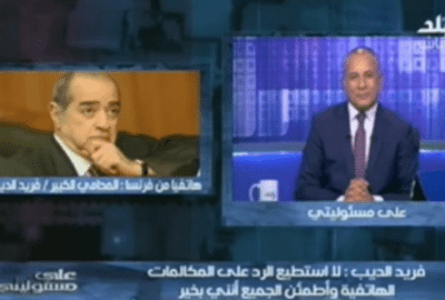قام المحامي فريد الديب، بمداخلة هاتفية، مع أحمد موسى، مقدم برنامج “على مسئوليتي”، المذاع على قناة “صدى البلد”، حيث قال: “الحمد لله حالتي الصحية كويسة.. أول ما ظهرت أعراض المرض.. عملت التحاليل في مصر.. وظهر أنه فعلا في سرطان في الدم”.