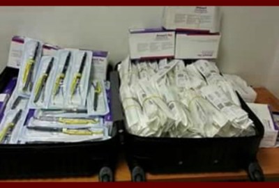 وتم تمرير حقائب الراكب على جهاز الفحص بأشعة X-RAY بمعرفة خديجه عبدالشافي مأمور الفحص، وتبين وجود أجسام غريبة داخل الحقائب، حيث تبين وجود 475 مثقاب أسنان، و48 وتر طبي داخلي، و8 أجهزة لقياس السكر، مخفاة بحقائبه بين طيات ملابس الراكب.