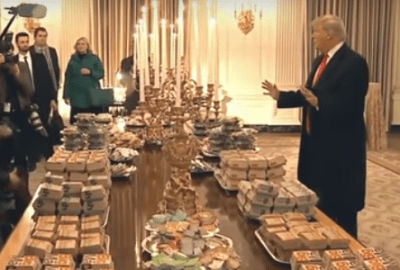 لجأ ترامب لطلب الطعام من سلسلة مطاعم أمريكية وهي ماكدونالدز، وبرجر كينج، ووينديز، وذلك بسبب الإغلاق الجزئي للحكومة، وأقر ترامب بأنه دفع الحساب بنفسه، ولم يفصح عن المبلغ.